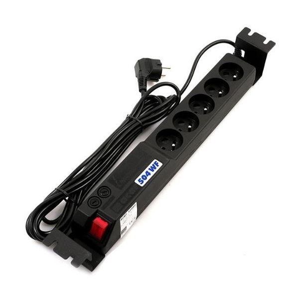 19" rozvodný panel 5x 230V, zásuvky dle ČSN, přepěťová ochrana, dvě pojistky, filtr proti rušení, 3m přívod. Včetně odnímatelných montážních držáků do racku.