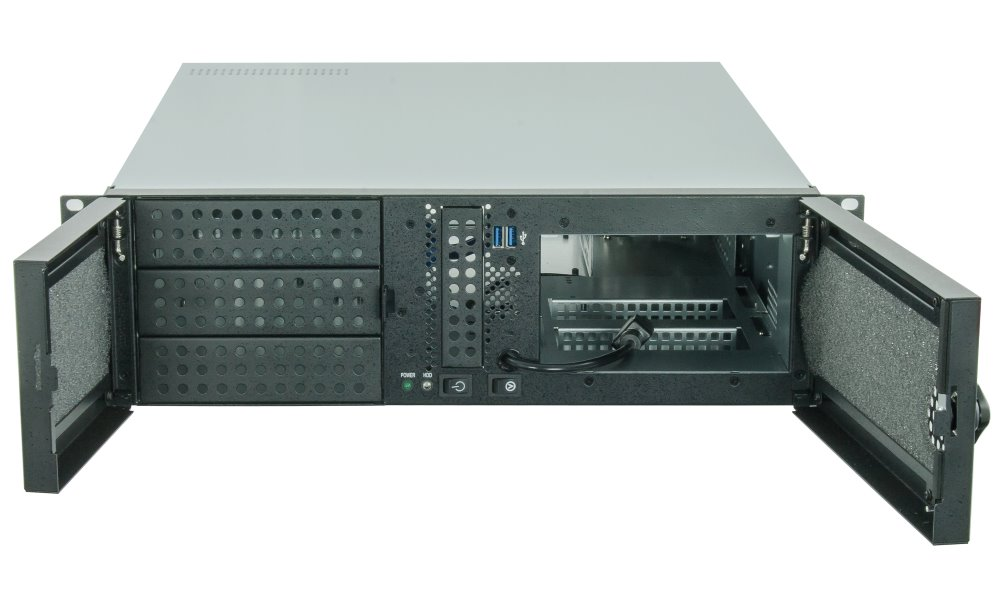 Racková skříň formátu 19" 3U nabízející tři 5,25" externí pozici a čtyři 3,5" interní pozice pro disky. Pro účinné chlazení jsou předinstalovány dva 60 mm ventilátory a jeden 80 mm ventilátor. Na čelní straně se nachází dva USB 3.0 porty. Skříň je dodávána se 400 W zdrojem.