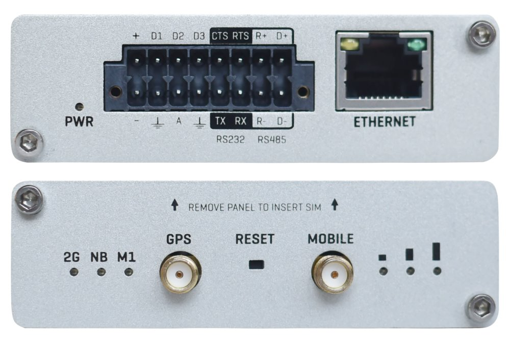 Rozhraní: 1 x RJ-45 LAN, 1 x 16pin terminálový blok (napájení, I/O vstupy/výstupy, RS232, RS485), 2 x SIM slot (interní)