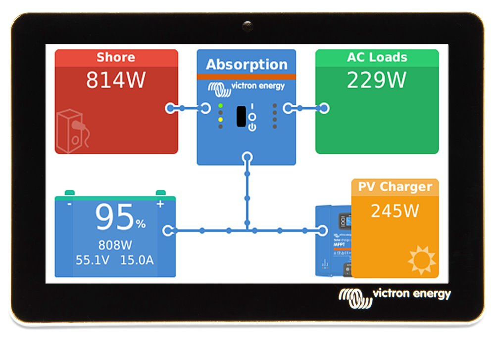 Dotykový displej GX Touch je optimalizován tak, aby splňoval standardy odborníků provádějících instalaci. Displej lze přišroubovat přímo na palubní desku, takže není zapotřebí vyřezávat vhodný otvor (jak tomu bylo u zařízení Color Control GX). Připojuje se pouze jedním kabelem, což znamená, že už nemusíte táhnout k palubní desce více kabelů.
