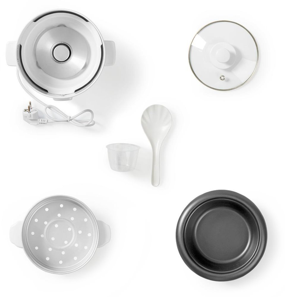 Rýžovar s nepřilnavým vnitřním hrncem z hliníkové slitiny o objemu 0,6 litru vám umožní servírovat dokonalou, nadýchanou rýži. Stačí změřit požadované množství rýže přiloženou odměrkou, vložit do nádoby a přidat správné množství vody vyznačené na vnitřní stěně nádoby. Po uvaření se nádoba automaticky přepne do nastavení pro udržování teploty, díky kterému bude mít rýže v době podávání jídla tu správnou teplotu. K dispozici je také napařovací vložka k vaření zeleniny zdravým způsobem, který zachová barvu, svěžest a vitamíny.