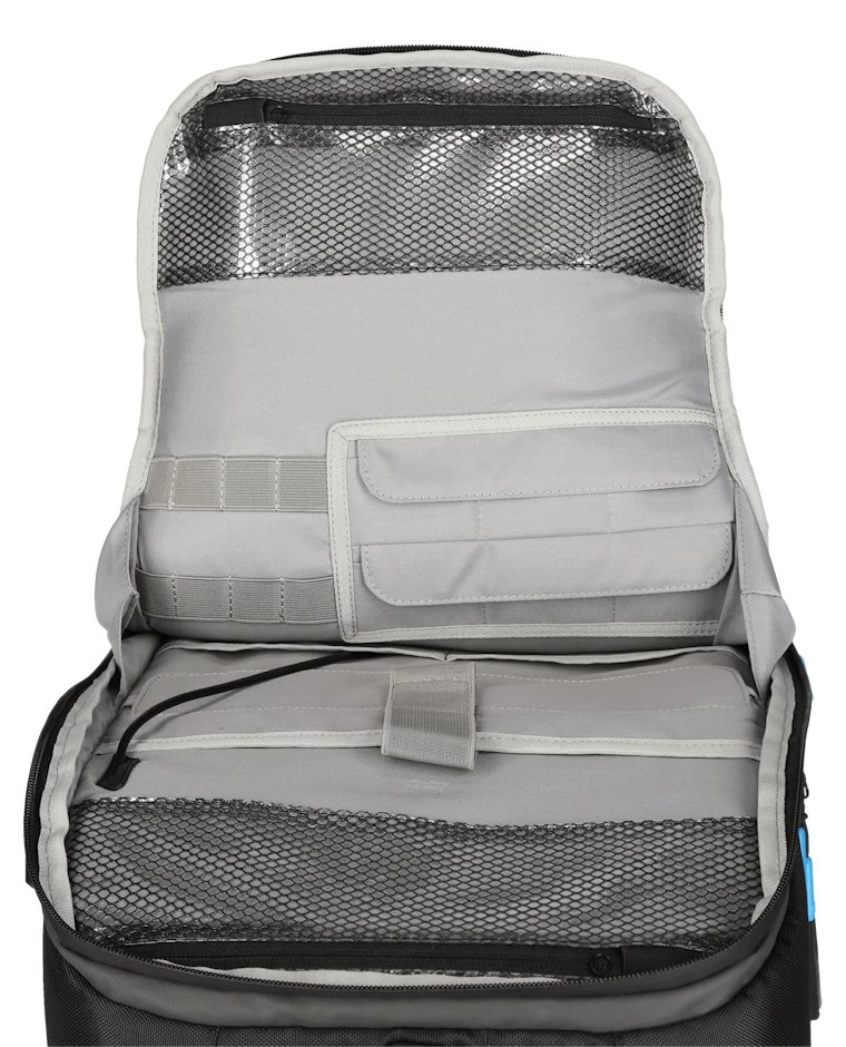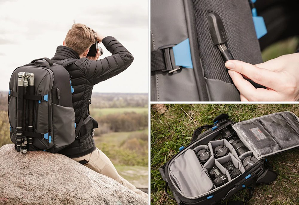 Mezi hlavní přednosti patří zabudovaný USB port pro dobíjení zařízení, úchyt na stativ a síťovaná kapsa na nápoje. Batoh je navržen s ohledem na pohodlí při nošení, má prodyšné polstrování a nastavitelné popruhy. Pro ochranu proti nepříznivému počasí je vybaven voděodolnými zipy a pláštěnkou uloženou ve spodní části.