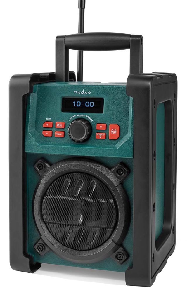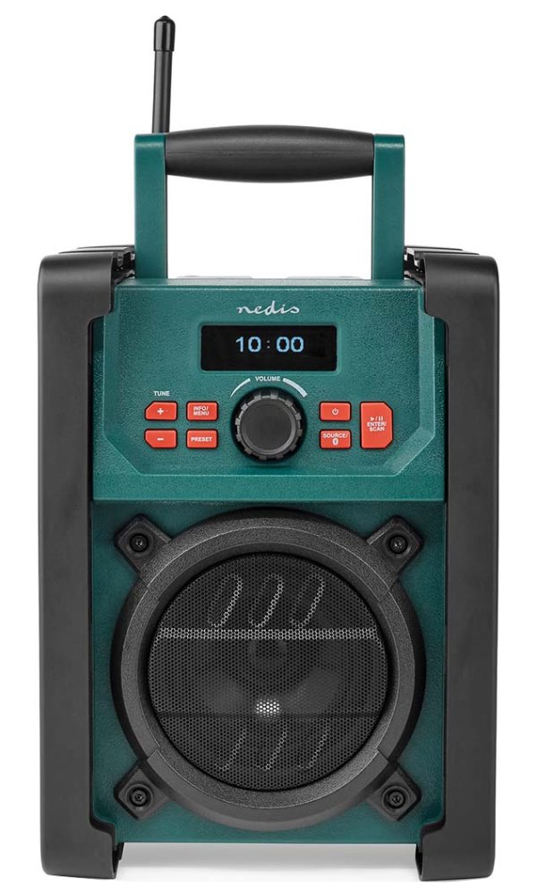 Robustní rádio Nedis RDDB3100GN je určeno pro poslech v náročném pracovním prostředí. Technologie DAB+/FM podporuje poslech vašich oblíbených rozhlasových stanic ve vysoké kvalitě digitálního zvuku. Díky konstrukci, která splňuje stupeň krytí IP65, si můžete poslechem hudby zpříjemnit práci na stavbě, v dílně nebo při práci na zahradě, protože rádio odolá vodě, dešti a také vniknutí prachu. K dispozici je 40 přednastavených volných pozic, na které si můžete uložit konkrétní radiostanice.