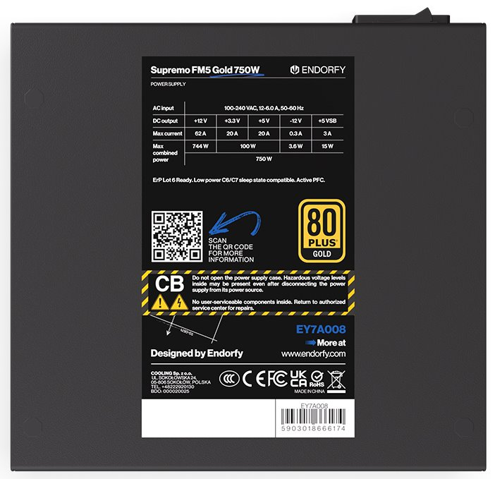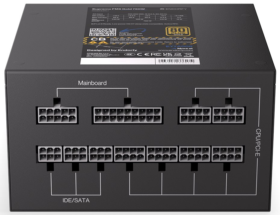 Napájecí zdroj o výkonu 750 W je osazen tichým, 120 mm velkým ventilátorem. Modulární kabeláž ušetří cenné místo ve skříni. Účinnost zdroje je 80PLUS Gold.