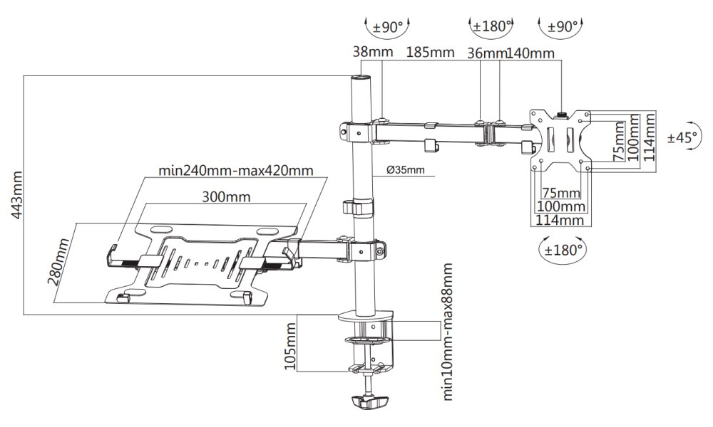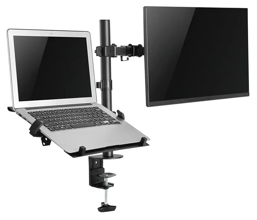 Flexibilní stolní VESA držák pro notebook a plochý LCD monitor o velikosti 10" až 32" a hmotnosti do 8 kg + 4,5 kg notebook. Držák je manuálně výškově nastavitelný v rozmezí od 0 do 44 cm. Tento stolní držák je vhodný pro obrazovky, které splňují vzor otvorů VESA 75 × 75 nebo 100 × 100 mm. Různé vzory otvorů lze pokrýt pomocí VESA adaptérů. Veškerý instalační materiál je součástí výrobku.