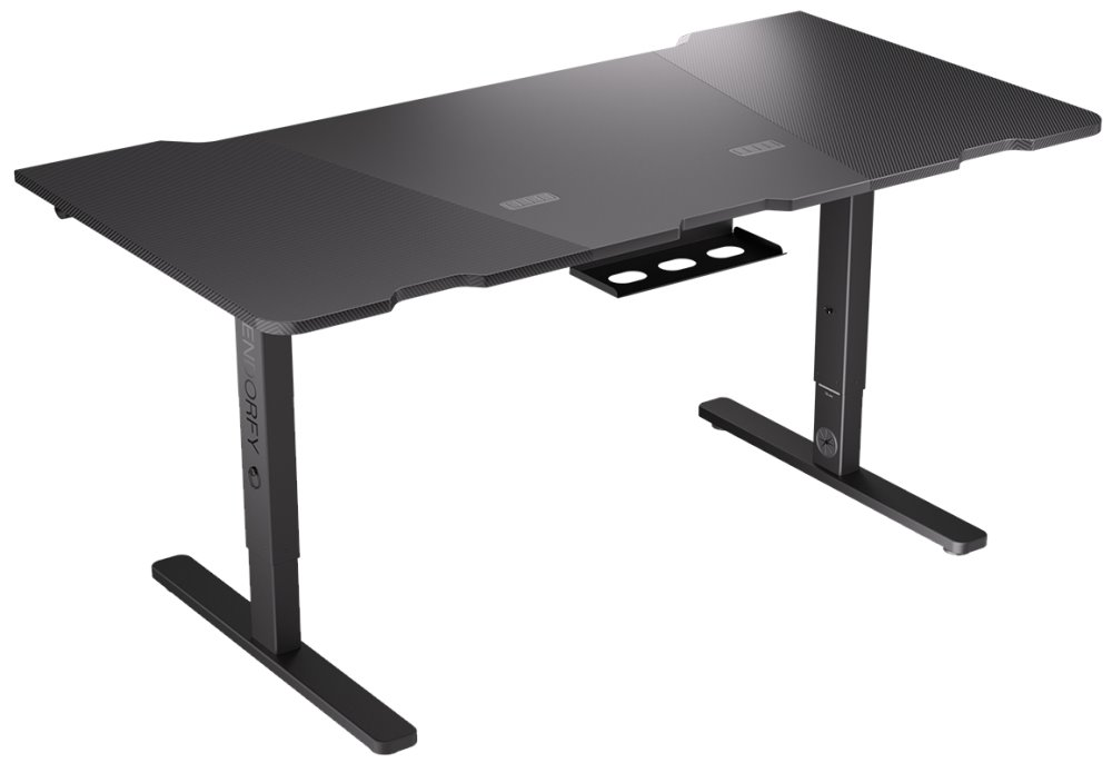 Herní stůl o délce 150 cm a šířce 78 cm nabízí dostatek prostoru pro myš, klávesnici a další příslušenství. Výšku lze nastavit ve čtyřech krocích (72, 75, 78 a 80 cm) tak, aby odpovídala vašim potřebám. Na spodní straně desky je umístěn systém pro správu kabelů, které lze následně vést průchodkami v nohách stolu. Maximální stabilitu zajišťuje robustní ocelová konstrukce s nosností až 80 kg. Povrchová úprava desky stolu ve stylu uhlíkových vláken nejen dobře vypadá, ale je také odolná proti poškrábání. V neposlední řadě zajisté potěší kovová polička pro napájecí lištu na zadní straně a háček pro zavěšení sluchátek.