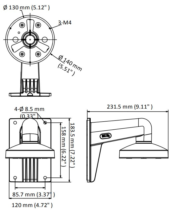 Nástěnný držák pro dome kamery Hikvision série D3xx. Zeď musí unést více než 3krát větší hmotnost, než je celková hmotnost kamery a držáku.