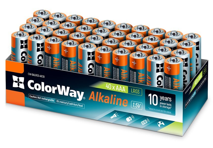 Alkalické baterie, vhodné pro běžné přístroje se střední až vysokou spotřebou energie a také pro ty s konstantním proudem, například dětské hračky, svítilny, rádia, lampy a zdravotnické pomůcky. Balení obsahuje 40 kusů baterií.