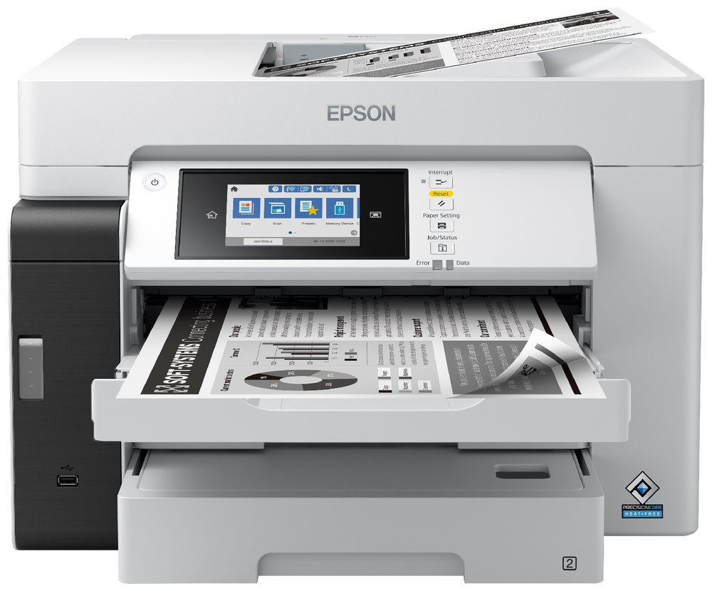 Díky dotykovému LCD displeji je tiskárna Epson EcoTank M15180 snadno nastavitelná a přehledně vám zprostředkuje všechny funkce a možnosti. Tento model je vybaven rovněž praktickým USB host portem pro přímý tisk z USB úložišť nebo podporou Wi-Fi. Díky bezdrátovému připojení můžete multifunkci Epson EcoTank M15180 jednoduše integrovat do sítě a tisknout ze smartphonů nebo tabletů skrze aplikace Apple AirPrint, Mopria či Epson iPrint.