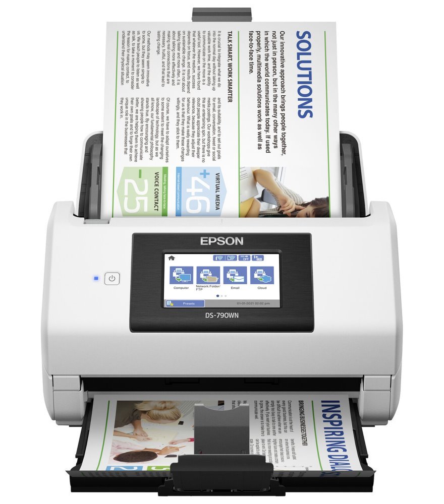Velkokapacitní skener s automatickým podavačem listů a softwarem Document Capture Pro pro automatický přenos do systémů pro správu dokumentů. Díky vysoké rychlosti skenování 45 str./min. barevně i černobíle, zásobníku na 100 listů a rychlému zpracování dat se jedná o skvělou volbu pro snadnou práci s dokumenty. Pro snadnější obsluhu je skener vybaven dotykovou obrazovkou, která nabízí možnost ovládat cílové umístění skenování bez nutnosti připojení k počítači. Skenujte přímo do síťových složek, e-mailu, USB flashdisku a oblíbených cloudových služeb. Pro připojení je možno využít USB, ethernetové připojení nebo Wi-Fi, které umožňuje flexibilnější umístění.