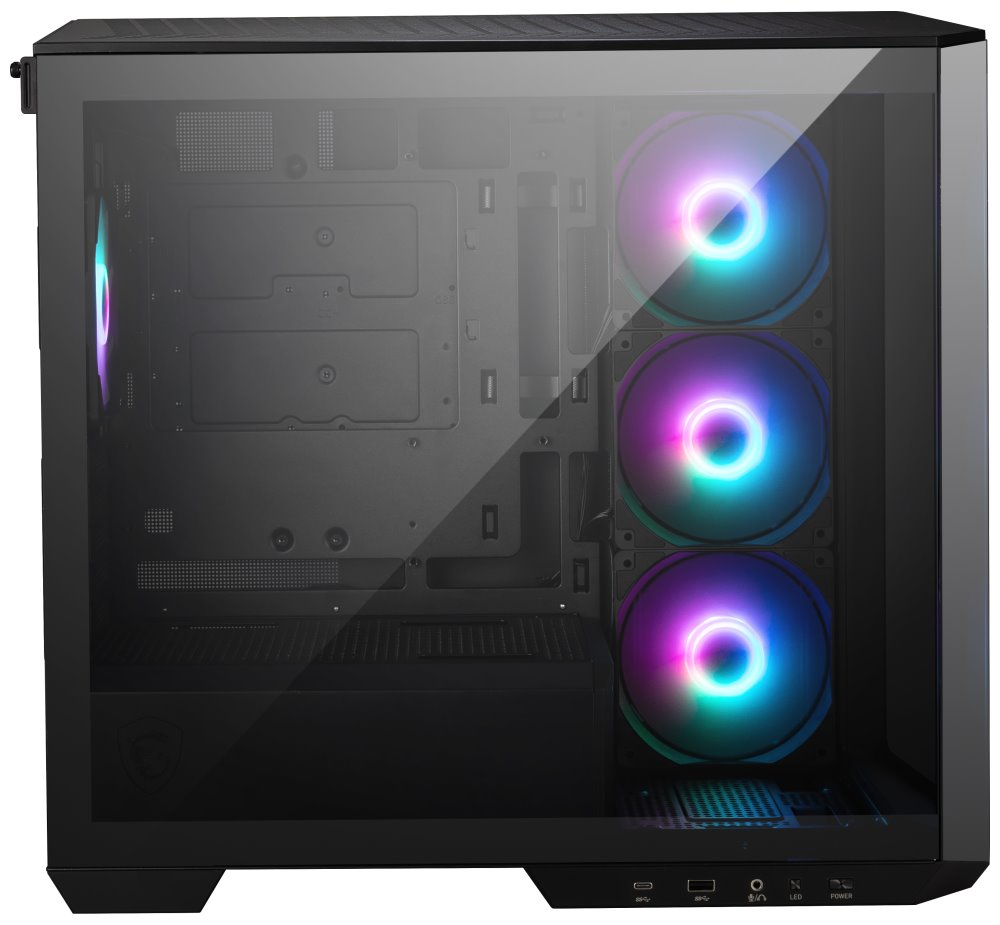 Chybět nesmí průhledná bočnice z tvrzeného skla, která vám poskytne jasný vhled do celého systému. A že bude na co koukat. Uvnitř skříně MSI MAG PANO M100R PZ najdete čtveřici předinstalovaných 120mm ARGB ventilátorů. Samozřejmostí je přítomnost prachového filtru, který zamezuje vniknutí nečistot a v případě potřeby jej můžete snadnou vyjmout a očistit. Kutilové jistě ocení uspořádání kabelů a jednoduchou montáž.