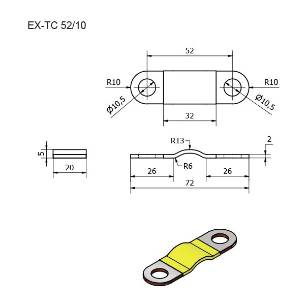 Rozměry: 72 × 20 × 2 mm (střední část má výšku 5 mm)