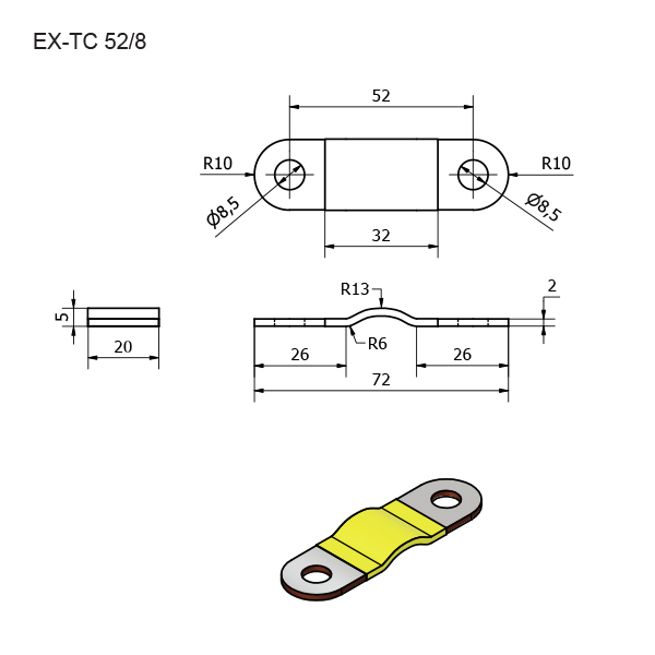 Rozměry: 72 × 20 × 2 mm (střední část má výšku 5 mm)