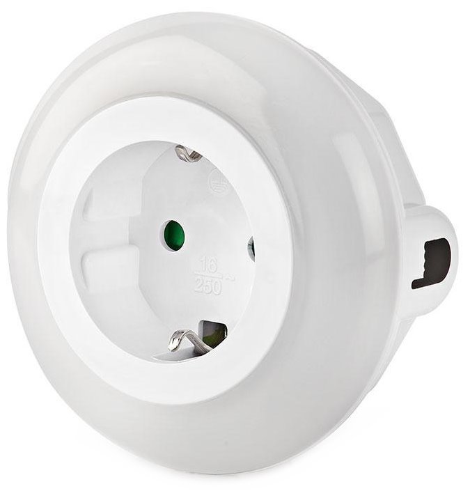 Kombinace zásuvky a noční svítilny v jednom zařízení. Zásuvka je síťově napájena (220–240 V AC) a podporuje zátěž až 3680 W. S kompaktním průměrem 82 mm a bílou barvou se snadno začlení do prostoru. LED osvětlení se díky integrovanému senzoru automaticky aktivuje v závislosti na úrovni okolního světla. Pomocí dotykového ovládání můžete snadno měnit barvu světla na bílou, modrou nebo zelenou.