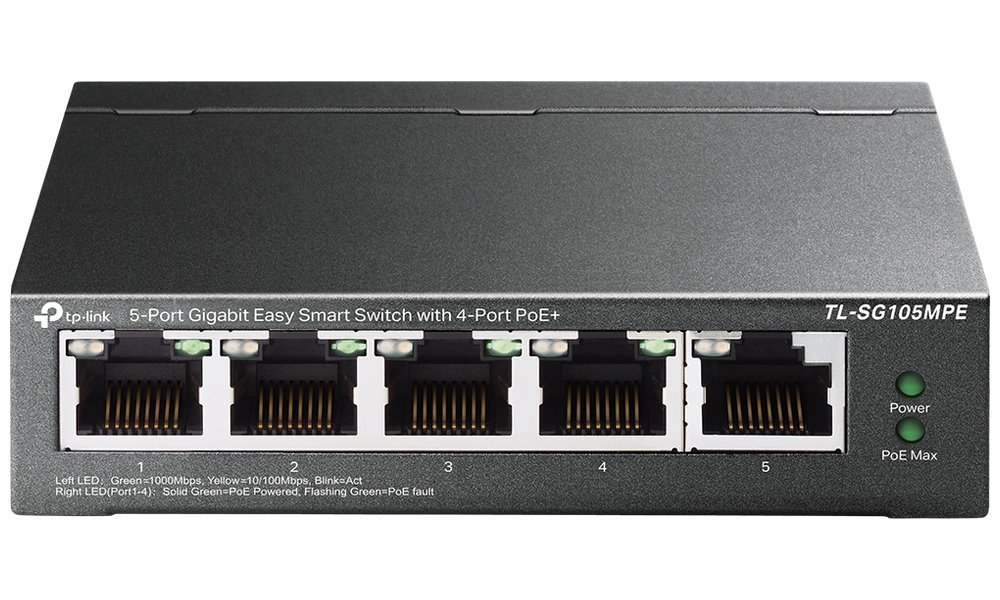 Switch nabízející 5 GbE RJ-45 portů, z nichž 4 podporují PoE+ (802.3 af/at) s celkovým napájecím výkonem až 120 W. Snadné použití přes web management nebo pomocí Easy Smart Configuration Utility. Přepínací kapacita dosahuje až 10 Gbps a rychlost směrování až 7,44 Mpps.