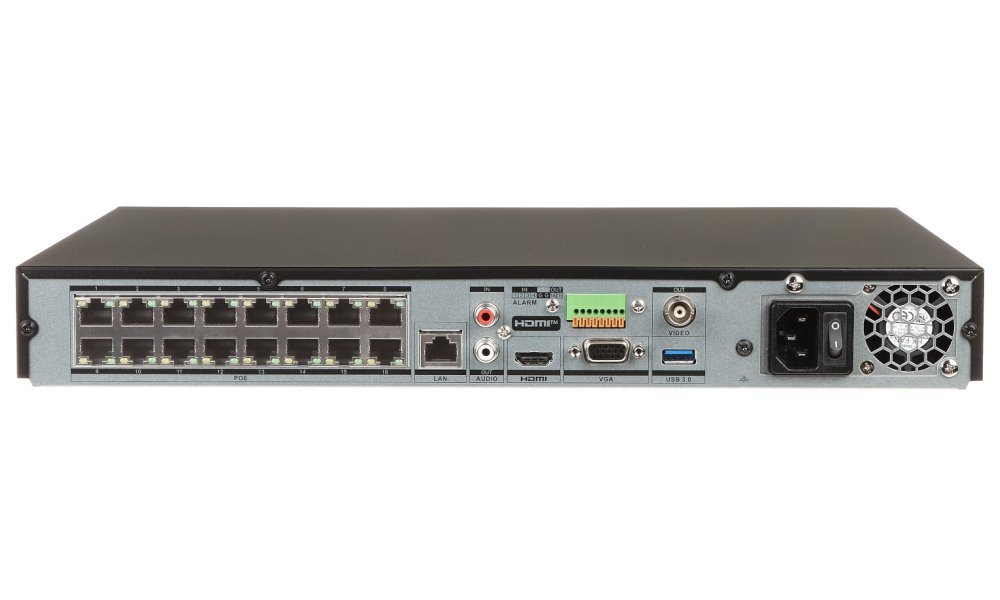 Porty: 1× 4K HDMI výstup, 1× VGA Full HD výstup, 1× CVBS video výstup (BNC), 1× USB 2.0, 1× USB 3.0, 1× RJ-45, 16× RJ-45 (PoE podpora), 4× alarm vstup, 1× alarm výstup, 1× audio vstup, 1× audio výstup