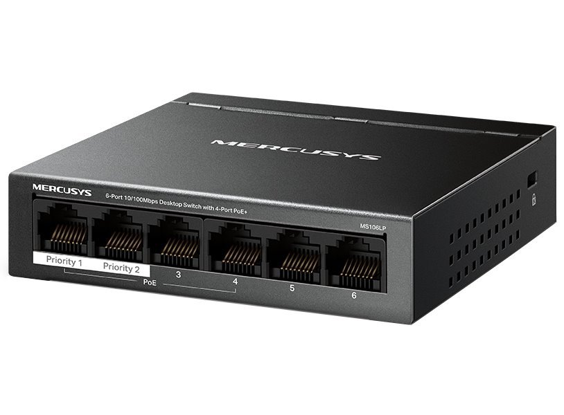 6portový switch s podporou PoE+ 802.3af/at v kompaktním provedení s podporou Auto-Negotiation a Auto-MDI/MDIX. Rychlost přenosu dat činí až 100 Mb/s při Half Duplex a až 200 Mb/s při Full Duplex spojení.
