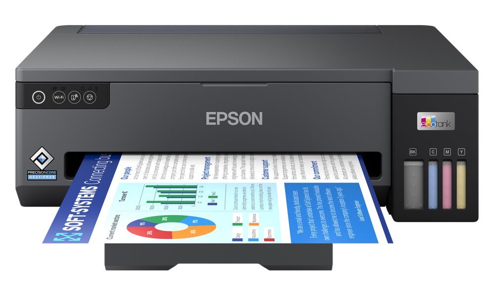 Barevná inkoustová tiskárna Epson EcoTank L11050 do domácnosti a malé osobní kanceláře, která se vyznačuje svobodou tisku a nízkými provozními náklady. Díky systému EcoTank přináší jednoduchý a praktický způsob doplňování inkoustových nádržek, umístěných v přední části. Jsou tak snadno dostupné a celý proces je otázkou okamžiku a bez rizika ušpinění.