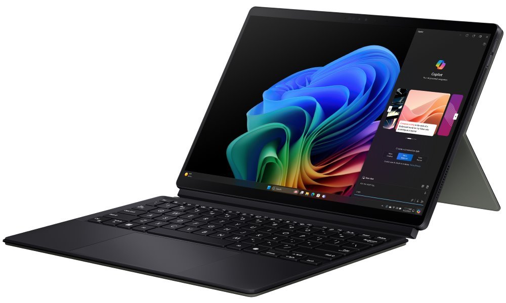 Výbava: Wi-Fi, Bluetooth, 5Mpx IR webkamera s podporou Windows Hello, 5Mpx zadní kamera, odnímatelná klávesnice, podpora Microsoft Copilot, čtečka paměťových karet, výklopný stojánek, certifikace Pantone, VESA DisplayHDR True Black 500, 100% pokrytí barevné škály DCI-P3, reproduktory Smart AMP, Qualcomm Hexagon NPU, USB-C 4.0, stylus ASUS Pen 2.0 SA203H, microSD adaptér