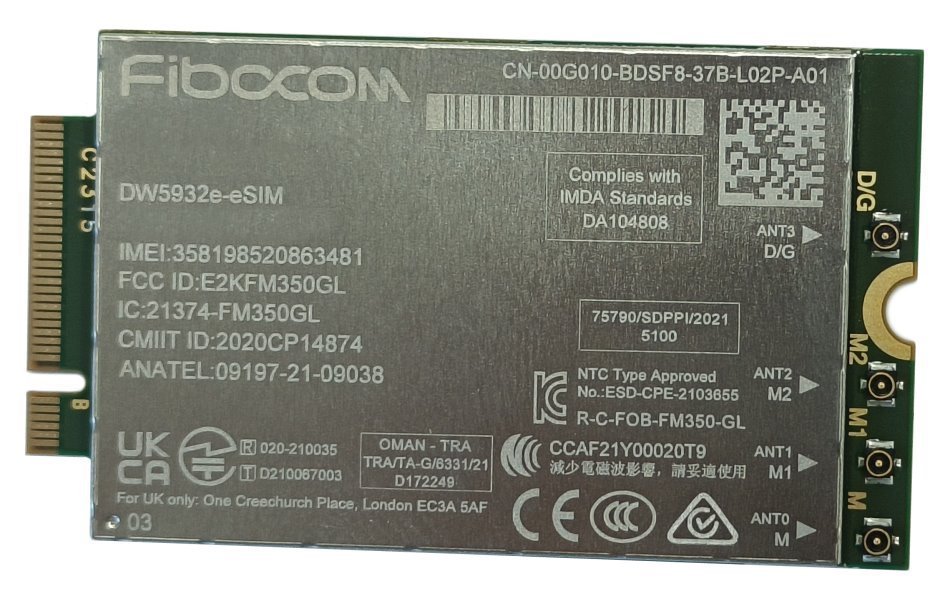 Bezdrátový komunikační modul pracující v pásmech NR FR1 (Sub6) FDD/TDD, LTE FDD/TDD, WCDMA a HSPA+. Podporuje také GPS, GLONASS, Beidou a Galileo. S rychlostí downlinku až 4,1 Gb/s a rychlostí uplinku až 2,2 Gb/s v pásmu 5G zvyšuje modul spolehlivost a dostupnost sítě vašeho počítače. Modul podporuje eSIM a klasickou SIM kartu skrze externí slot (v notebooku).
