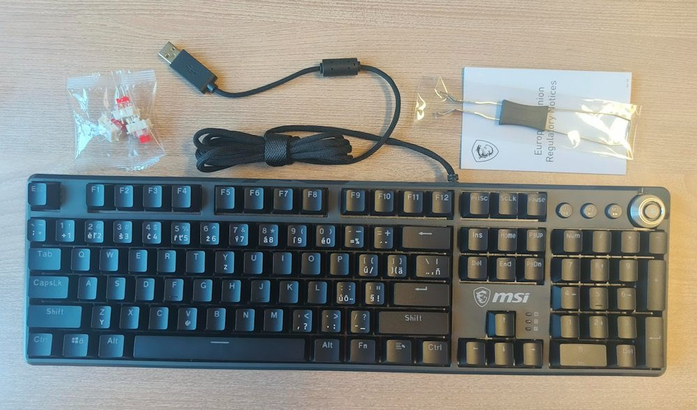 Mechanická herní klávesnice disponující spínači MSI Red, které zajišťují rychlost, přesnost a životnost více než 60 milionů stisků. Navíc umožňuje bez námahy vyměnit výchozí mechanické spínače za spínače třetích stran (3pinové) bez nutnosti pájení. Nabízí možnost RGB podsvícení kláves s předdefinovanými efekty. Vhod jistě přijde také funkce Anti-ghosting s N-Key rollover. Klávesnice disponuje tlačítky, které vám umožní rychle upravovat světelné efekty, spravovat ovládací prvky médií a přistupovat k widgetům. Odnímatelný magnetický horní kryt doplňuje matný kovový povrch klávesnice. Snadno jej připevníte nebo odejmete a spojíte tak estetický vzhled s praktickými výhodami, jako je snadnější údržba. Špičkové pohodlí zajistí ergonomická konstrukce kláves s vysokým sklonem, která udržuje přirozenou polohu ruky a zápěstí. Připojení je realizováno skrze opletený USB kabel o délce 1,8 m.