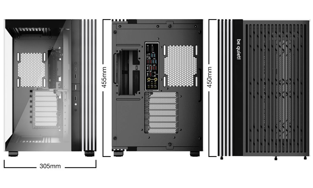 Další předností je podpora přemístitelných nožiček, díky čemuž můžete PC otočit a umístit ve svislé i vodorovné poloze. PC skříň Be quiet! LIGHT BASE 600DX nabízí až 10 pozic pro ventilátory a 2 integrované rozbočovače ventilátorů s ARGB. Po této stránce je skříň mimořádně univerzální a ve spojení s prostorem uvnitř vám umožní vytvořit rozmanité konfigurace s extrémně výkonnými grafickými kartami, radiátory nebo základními deskami ve formátu ATX, Micro ATX, Mini-ITX.