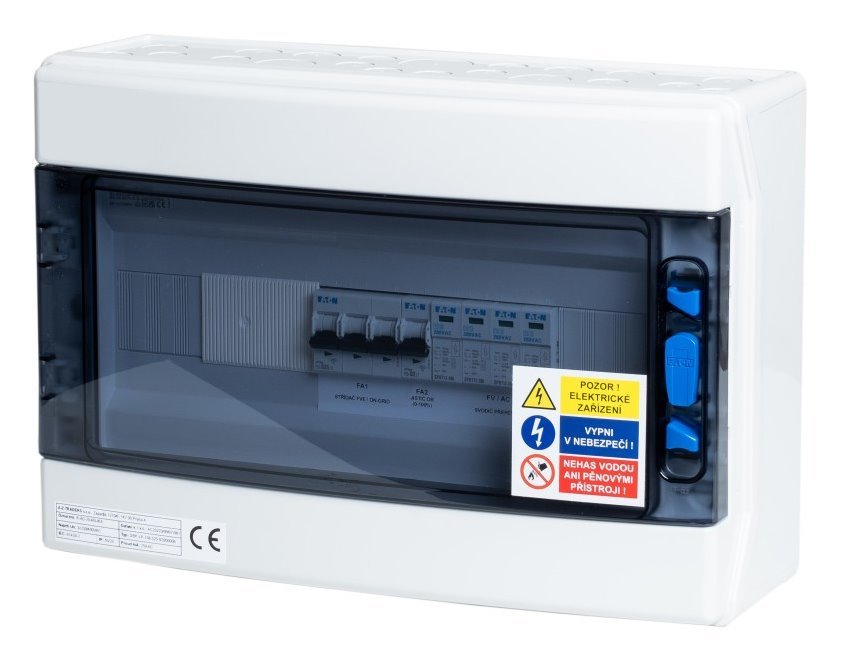 V rozvaděči je osazen svodič přepětí AC T1+T2, jistič B25/3 pro jištění vstupu do střídače a jistič B2/1, který jistí PATICI/RELE Finder, které zajišťuje N0% pro splnění podmínek distribucí (součástí je jak NC, tak NO kontakt a střed). Tím je zajištěno použití pro všechny typy měničů na trhu.