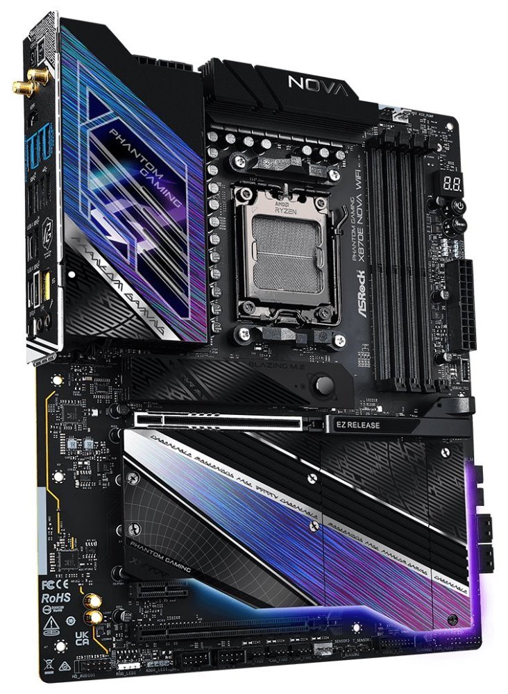 Díky tomu je základní deska ASRock X870E Nova WiFi ideální pro extrémní multitasking a nekompromisní výpočetní výkon. Rozhraní PCIe Gen5 Blazing M.2 představuje řešení pro vysokorychlostní SSD jednotky. Díky násobně vyšší šířce pásma můžete ultrarychlá úložiště využít naplno. Extra velký chladič M.2 z hliníkové slitiny zajistí efektivní chlazení disku M.2 SSD. Na své si přijdou také kutilové, kterým provedení desky poskytuje dostatek možností pro jejich stavební záměry. Základní deska ASRock X870E Nova WiFi dbá také na řádnou konektivitu.