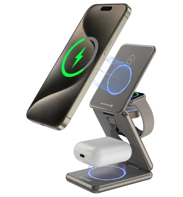 Praktická bezdrátová nabíječka nabízí tři nabíjecí plochy, díky čemu umožňuje nabíjet současně telefon, hodinky i sluchátka. Disponuje rychlým nabíjením o výkonu 15 W pro chytrý telefon, 5 W pro sluchátka a 3 W pro chytré hodinky. Nabíječka je kompatibilní s technologií MagSafe pro iPhone 12 a vyšší. Držák s MagSafe zachovává kompatibilitu s nabíjením Qi, takže se dá používat i k bezdrátovému nabíjení iPhonu 8 a novějších modelů. Předností je také skládací a rozkládací funkce. Díky svým rozměrům se vám vejde bez problémů do kapsy. Ve složené pozici můžete nabíjet pouze telefon. Při naklonění nabíjecí části telefonu, můžete zároveň nabíjet telefon i hodinky. V kompletně rozložené pozici můžete nabíjet všechny zařízení najednou.