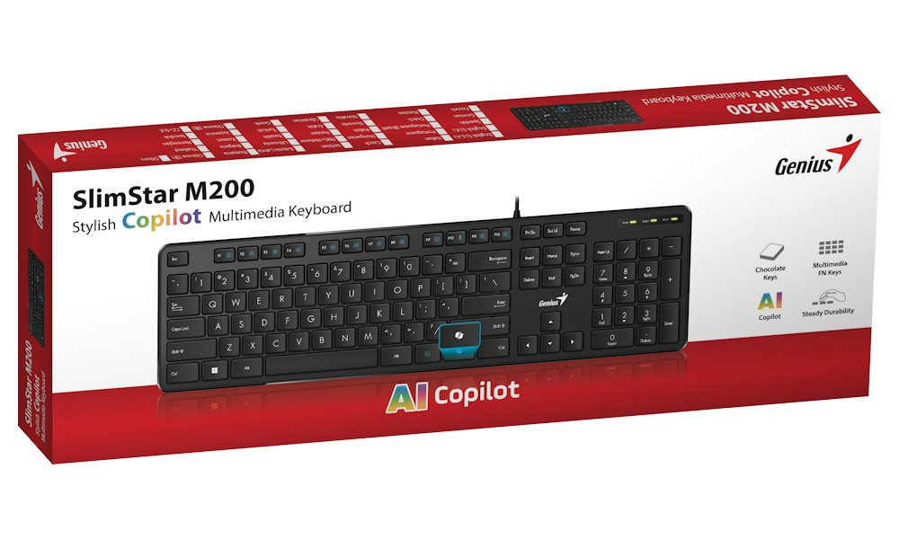 Klávesnice Genius Slimstar M200 Copilot, na kterou se můžete spolehnout každý den ve firemní kanceláři. Jednoduchý design s nízkoprofilovými klávesami zajišťuje příjemný stisk a tichý chod. Součástí je numerická část, díky čemuž je zadávání číselných znaků rychlé a jednoduché. Klávesnice Genius Slimstar M200 Copilot přináší také jednoduché řešení pro podporu produktivity.