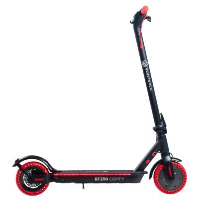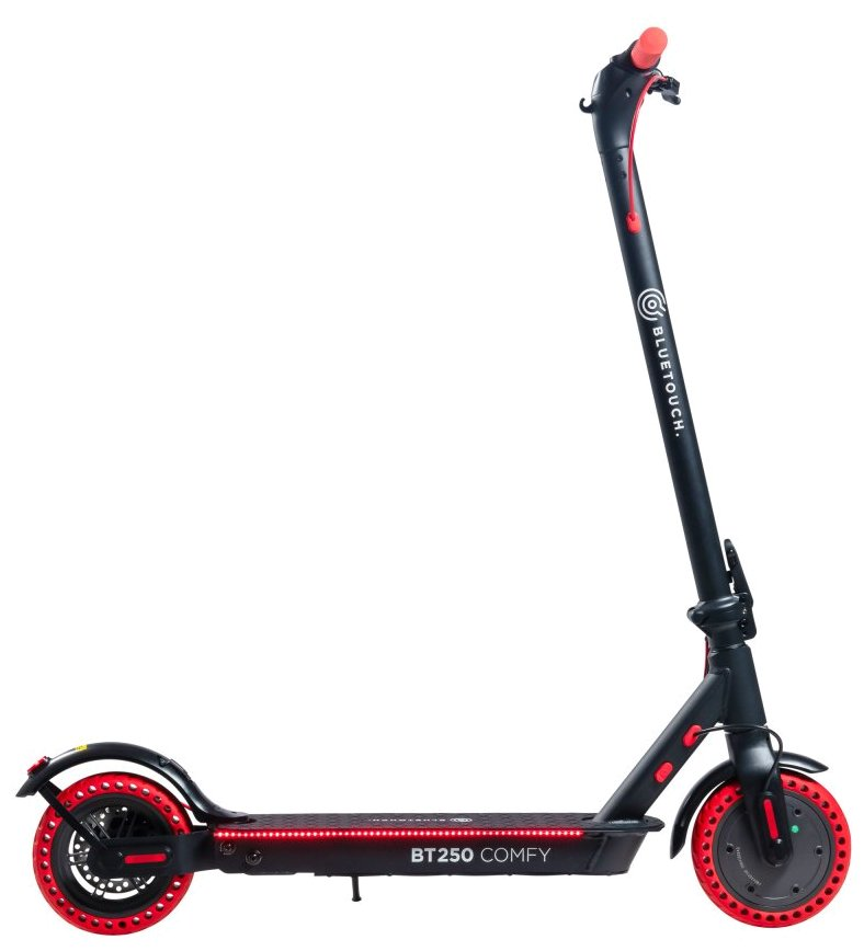 E-koloběžka BLUETOUCH BT250 COMFY disponuje plně perforovanými pneumatikami o velikosti 8,5", které nevyžadují údržbu, podporují dobrou přilnavost a zvýšenou odolnost proti poškozeni. Skládací mechanismus je praktický především pro uskladnění v interiéru. Elektrickou koloběžku BLUETOUCH BT250 COMFY snadno uložíte v pokoji nebo v kufru auta. Hmotnost pouze 14,8 kg umožní přenášení na krátkou vzdálenost nebo vynesení do schodů. Samozřejmostí je přítomnost předního a zadního LED osvětlení pro bezpečnou jízdu za slabého osvětlení nebo ve večerních hodinách.