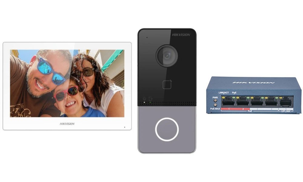 Sestava skládající se z dveřního interkomu, bytového monitoru a PoE switche.