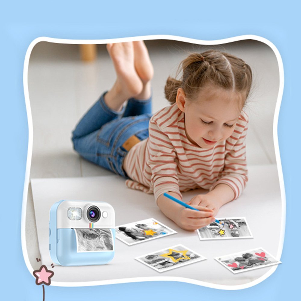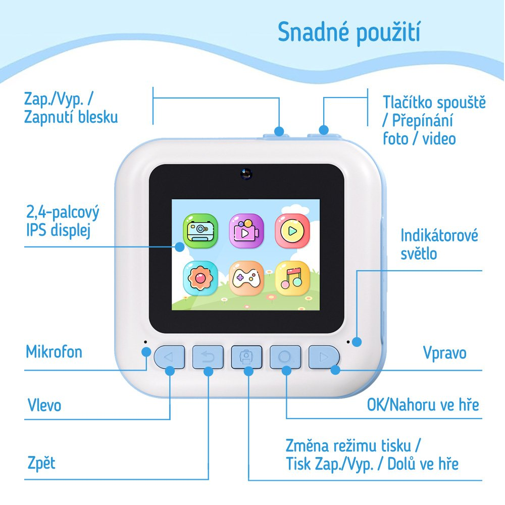 Dětský fotoaparát, který kombinuje funkce digitálního fotoaparátu a termální tiskárny, což umožňuje dětem okamžitě vytisknout své oblíbené snímky. Díky termální technologii tisku není potřeba inkoust ani drahé cartridge - stačí vložit roli papíru (3 jsou součástí balení) a ihned tisknout pořízené fotografie.