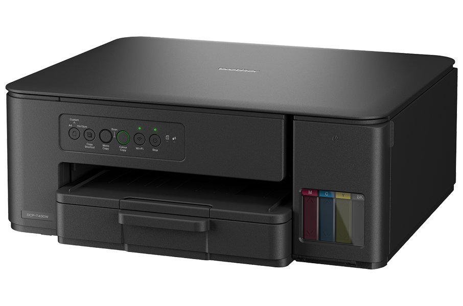 Brother DCP-T430W je multifunkční zařízení kombinující tisk, skenování a kopírování v jednom kompaktním těle. Díky unikátnímu systému inkoustových nádržek poskytuje extrémně nízké náklady na tisk barevných dokumentů. Zařízení je vybaveno 5GHz Wi-Fi připojením a podporuje tisk z mobilních zařízení prostřednictvím aplikace Brother Mobile Connect.