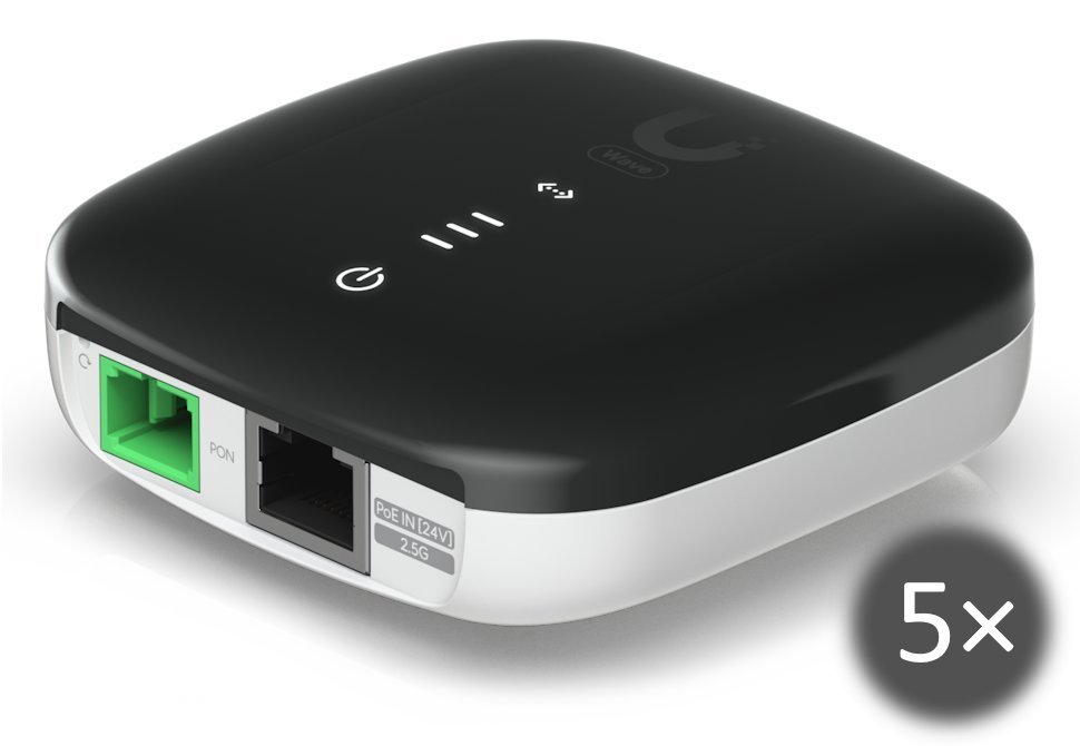 Součástí balení je 5× Ubiquiti WaveFiber ONU (bez zdroje v balení).