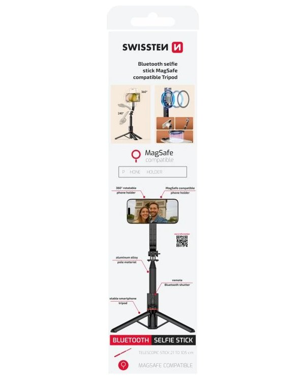 Bluetooth selfie tyč SWISSTEN Bluetooth Selfie Stick Tripod kombinuje teleskopickou konstrukci s odnímatelným dálkovým ovladačem a skládacím stativem. Díky podpoře MagSafe jednoduše přicvaknete kompatibilní telefon bez nutnosti složitého uchycení a okamžitě začnete fotit nebo natáčet. Sedmisegmentová teleskopická tyč se vysune z kompaktních 21 cm až na 105 cm a přitom váží pouhých 180 g, takže se snadno vejde do batohu i kabelky.