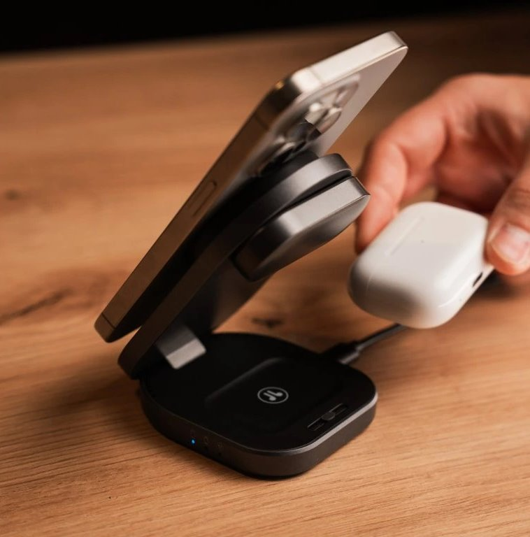 Elegantní 3v1 bezdrátová nabíječka s nejnovější Qi2 technologií pro současné nabíjení iPhone, Apple Watch a AirPods.