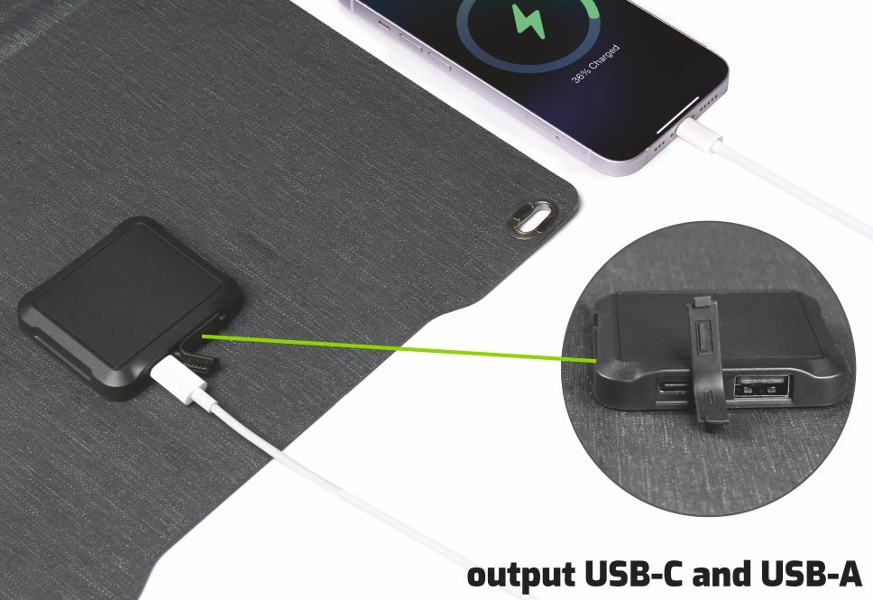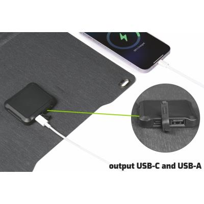 Praktický skládací design umožňuje snadné přenášení a skladování. V rozloženém stavu dosahuje rozměrů 630 × 290 × 20 mm, po složení se zmenší na kompaktních 290 × 210 × 30 mm. S hmotností pouhých 650 g se snadno vejde do batohu. Panel disponuje dvěma výstupy – USB-C a USB-A, což umožňuje současné nabíjení více zařízení.