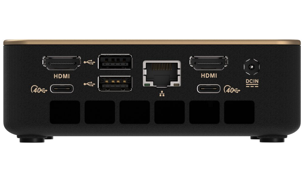 Zadní I/O: 1× DC jack, 2× HDMI 2.1, 2× USB-C 4.0 (PD 3.0), 1× USB 3.2 Gen2, 1× USB 2.0, 1× RJ-45 (2,5G LAN)