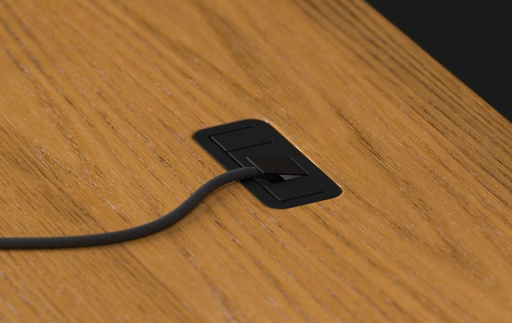 Stůl nabízí komplexní systém pro organizaci kabelů, včetně pogumované průchodky v rovině s deskou a diskrétní police na napájecí lištu. Výřez na zadní hraně umožňuje elegantní uchycení držáku monitoru bez poškození stěny.