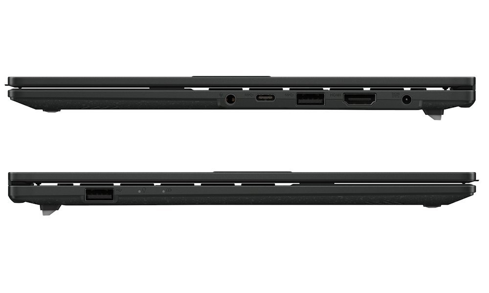 Notebook disponuje kompletní sadou portů včetně 1× USB 2.0, 1× USB 3.2 Gen1 a 1× USB-C 3.2 Gen1. K dispozici je také HDMI 1.4 výstup a 3,5mm combo audio jack. Bezdrátové připojení zajišťuje Wi-Fi 6 (802.11ax) s dual band podporou a Bluetooth® 5.2.