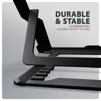 Konstrukce z hliníkových odlitků garantuje dlouhou životnost a stabilitu i při zatížení až 20 kg. Protiskluzová úprava chrání zařízení před poškrábáním a zajišťuje pevné uchycení bez nežádoucích pohybů. Otevřený design stojanu podporuje efektivní odvod tepla z notebooku, což přispívá k lepšímu výkonu a prodloužení životnosti zařízení.